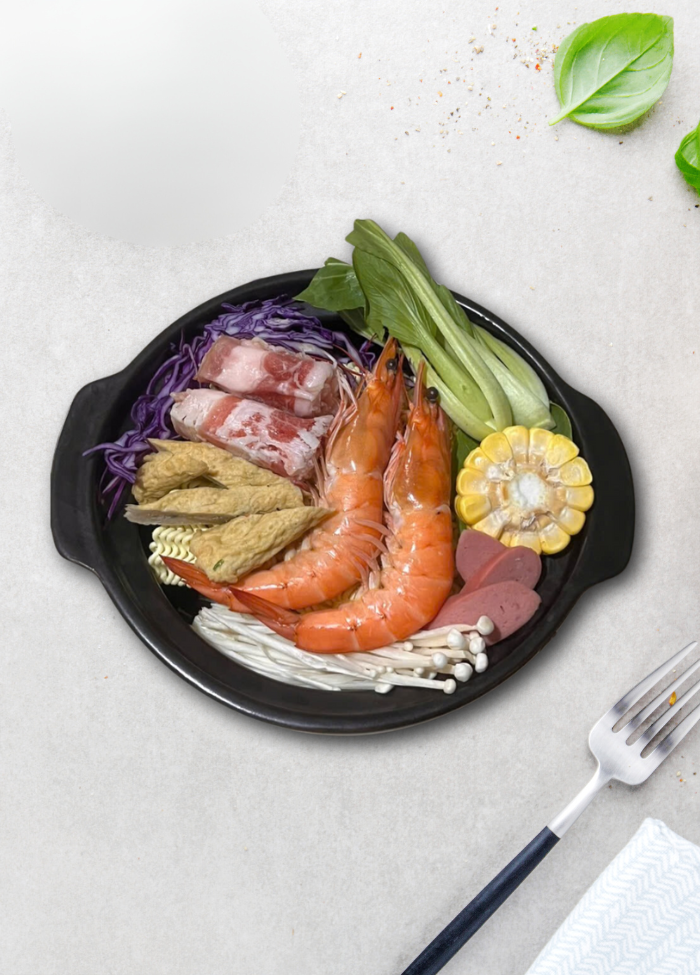 có tôm, chả cá HQ, thịt bò mỹ, xúc xích và rau nấm